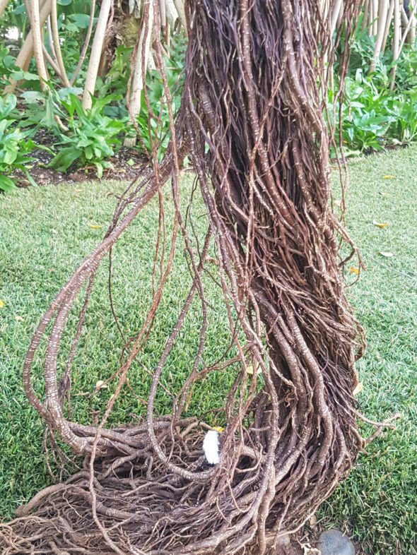 照片中的大樹向下扎根的同時,美麗的白色小天使躺臥在其中